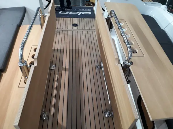 nuevo modelo y actualización del clásico "45". La bañera está equipada con una mesa plegable que no es tan práctica como parece. La cocina se ha desplazado hacia delante, aumentando el espacio de navegación para el capitán (situado frente a los camarotes traseros) y para la zona de asientos del salón, que también se puede reorganizar. El ambiente de fiesta relajado de este Elan se complementa con la parrilla, que viene de serie.Está disponible en dos versiones: el cliente puede elegir un aspecto más deportivo con un respaldo cerrado o una versión de vacaciones con una gran plataforma de baño.